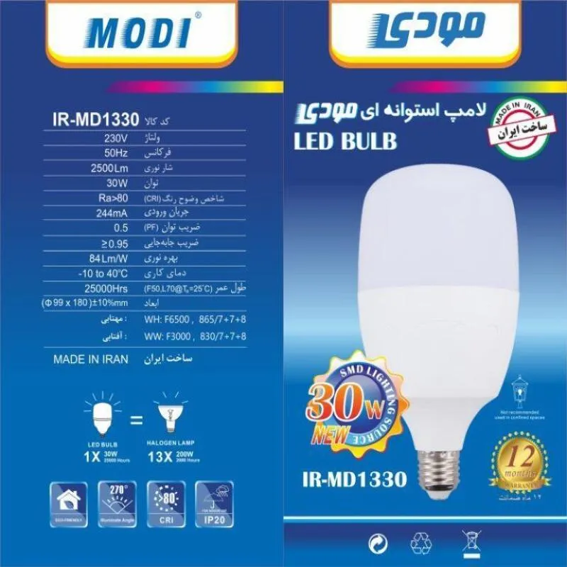 لامپ استوانهای 30 وات مودی با نوردهی بالا و مصرف اقتصادی، مناسب فروشگاه، انبار و پارکینگ. خرید از مستر الکترون با ارسال سریع به سراسر ایران.
